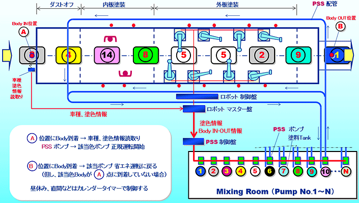 中上塗り塗料供給システムにおいて、塗装ブースに到着したワークの塗色情報を自動塗装システムから受け取り、対象の塗料ポンプを省エネ運転からアクティブ運転(正規運転)に自動制御します。対象塗色の塗装が終れば、再び省エネ運転に戻します。塗料供給のフローコントロールシステムは、必要なときに必要なだけの塗料流量へ自動制御することで、省エネやVOCの削減に貢献します。