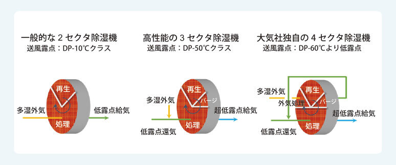 根据所需露点温度及安装条件等要求,我们将从常规双区除湿机、高性能三区除湿机以及大气的独创四区除湿机中,为您提供最优化的除湿系统方案。