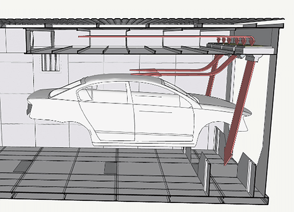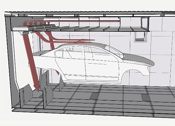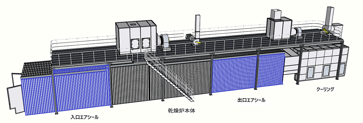 涂装干燥炉出入口因乱流扰动现象导致炉内热气向外泄漏,恶化工厂环境。我司研发出可实现与山型炉相当的热气隔绝性能的空气密封装置,即使在平型炉中也能有效改善工厂环境并实现节能。