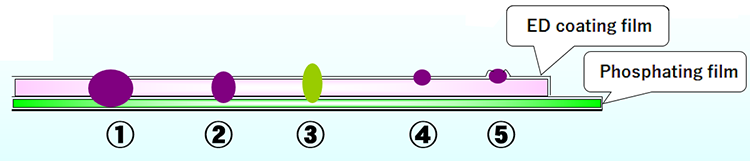 附着于车身上的前处理·电泳工序相关颗粒的附着模式如下图所示,而通过引入I-LAS系统,可以有效去除其中①②③类模式的大部分颗粒。