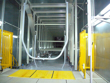 这是涂装工厂中作为首道工序的前处理·电泳工序所使用的悬挂式输送机。根据方式和能力不同,分为多种类型。