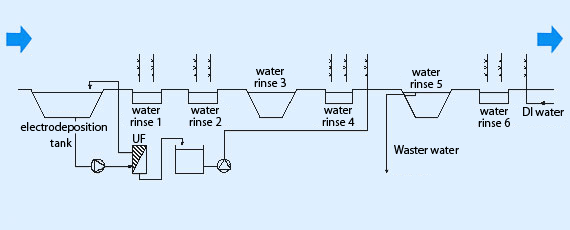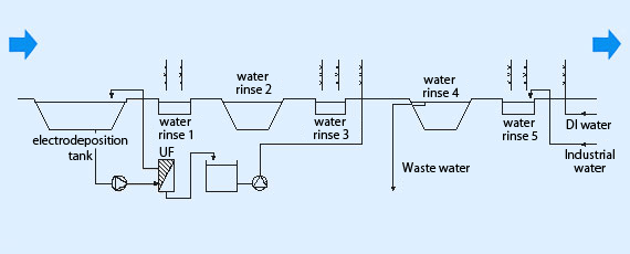 UF rinse in three stages, industrial water rinse in two stages, full-dip stage