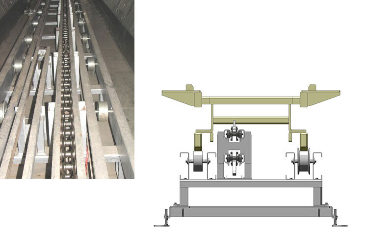 This is the standard transportation method in Europe. Since it is a tact type, it basically operates only when a skid is detected. Therefore, it is possible to improve energy efficiency. In addition, right-angled transport increases space efficiency. Since the friction method is used except for the treatment process, you are freed from chain maintenance. It can automatically handle the transfer to the chain conveyor and the transfer of the work (automobile body).
