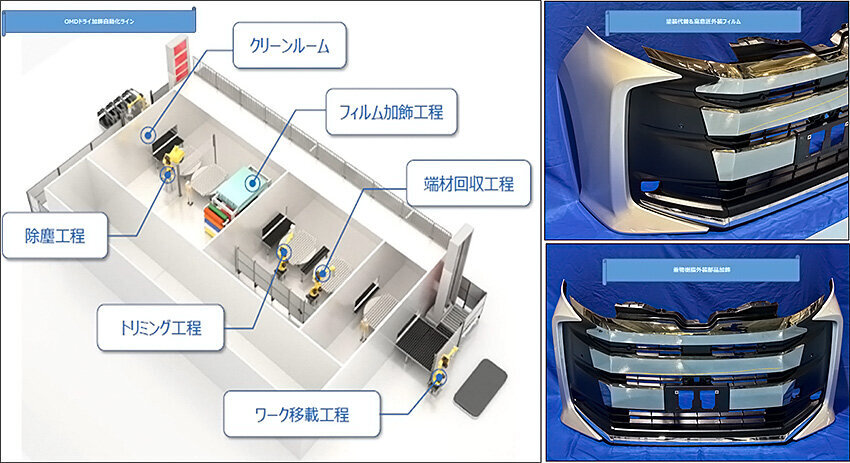 塗装工程のカーボンニュートラル化に向け、従来のスプレー塗装に代わる塗装方式を模索しており、各種加飾システムの検討を進めています。フィルムの加飾貼合技術を用いた場合、スプレー塗装の工程がなくなることから低炭素化が実現し、排水・排気処理装置も不要となるため、環境面でのメリットが期待できます。