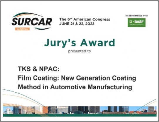 当社グループTKS Industrial Companyと日本ペイント・オートモーティブコーティングスとの共同発表が自動車塗装技術国際会議「第6回SURCAR 2023 in Detroit」にてJury's Awardを受賞~高さ700mm以上の曲率の大きい一体型バンパーにも対応できる、ドライ加飾技術が高く評価~