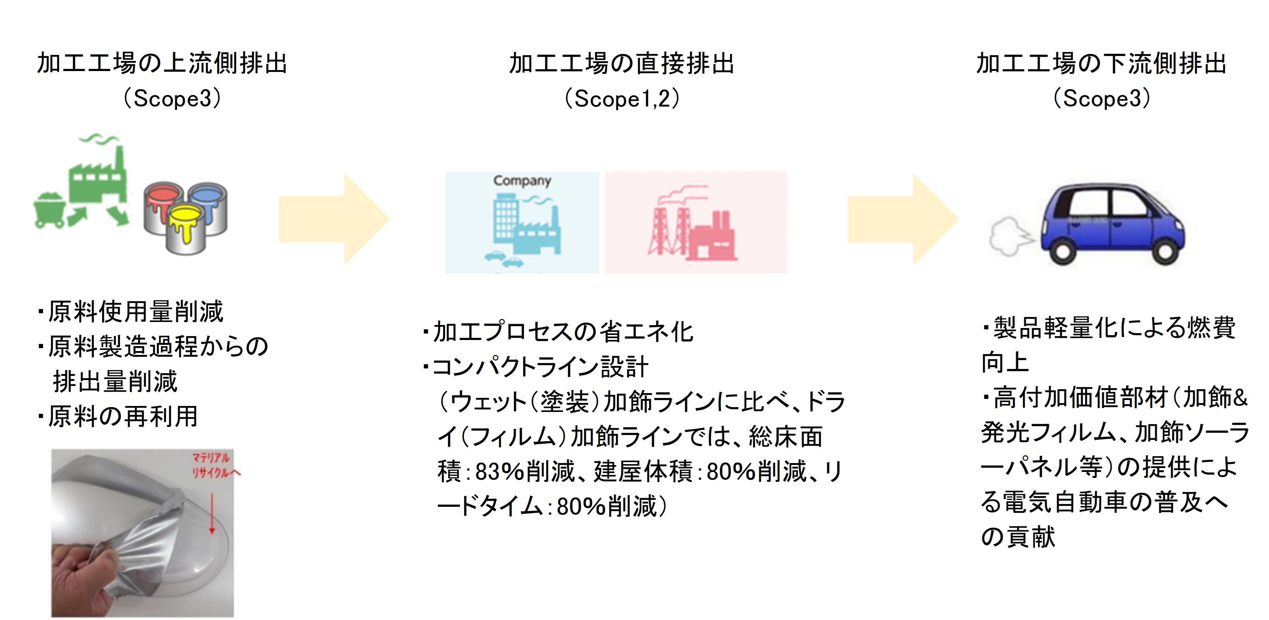 従来のウェット塗装では通常、電着塗装、中塗り、上塗りと塗装を繰り返します。そうした重ね塗りの過程で塗装と乾燥を繰り返すウェット塗装に対し、高被覆率のフィルム加飾(ドライ加飾)では、従来の塗料を使用した塗装に比べて、加工工場での直接排出(Scope1,2)部分で大幅に使用エネルギーを抑えることができ、50%以上の削減を達成しています。今後さらに、加工工場の上流・下流(Scope3)部分で被塗物基材やフィルム基材のリサイクルなどの工程革新が実現することにより、さらなるCO₂排出量の削減効果が期待できます。