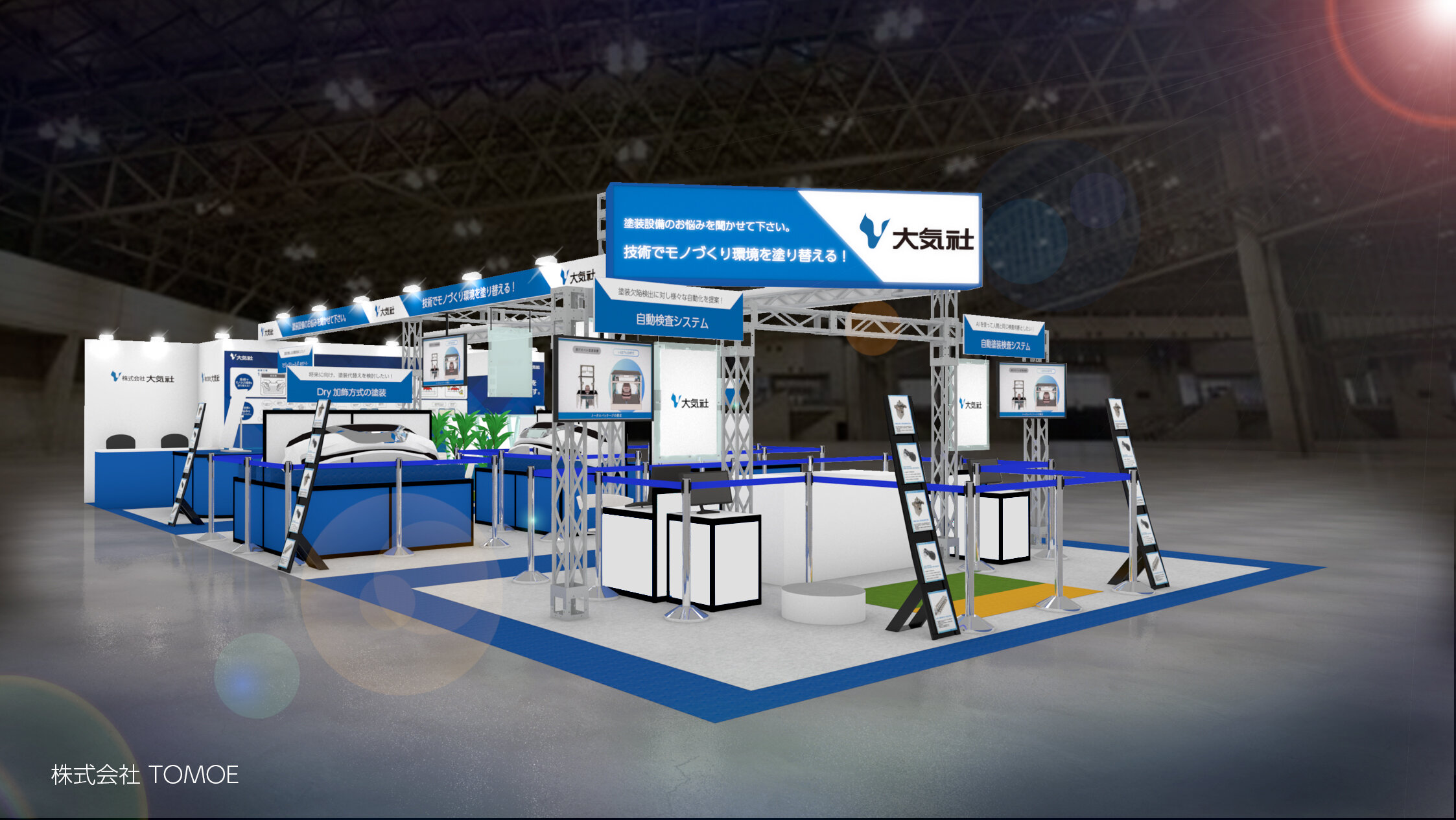 「技術でモノづくり環境を塗り替える!」をテーマに、お客さまが抱える塗装現場のお困りごとを伺い、課題解決に向けたソリューションを提供する展示となっています。
