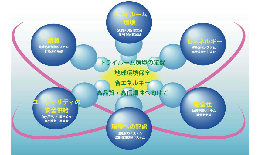 空調・排気処理の複合ソリューションとして、低コスト・省スペースで高性能なドライルーム(低露点製造室)を提供。特に、画期的なNMP回収システムは、メンテナンス性、省エネ、ランニングコストに優れ、国内トップクラスの実績を誇っています。