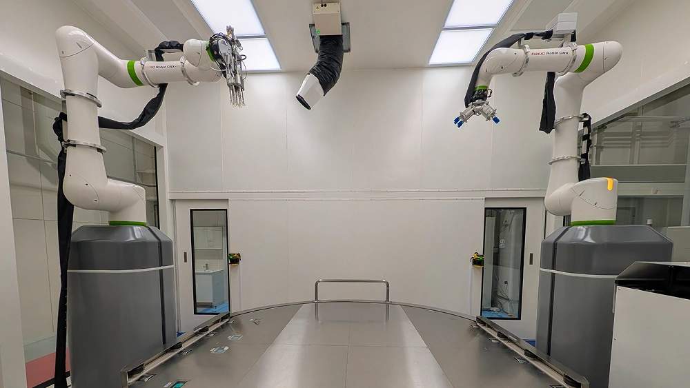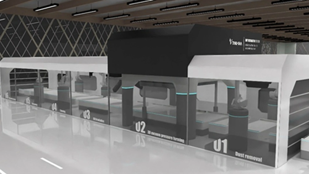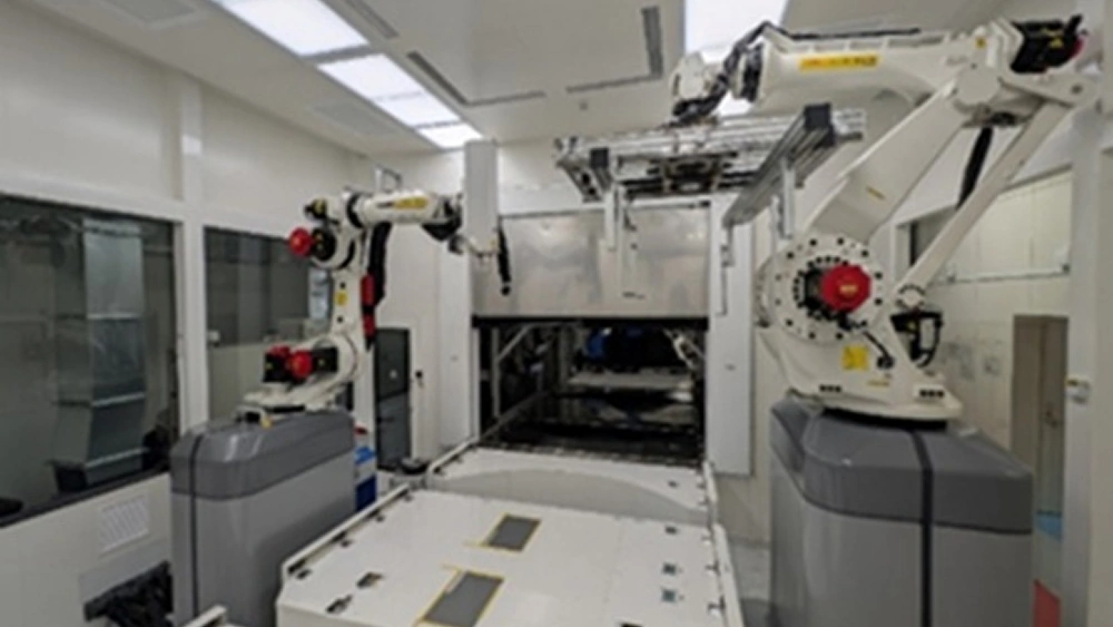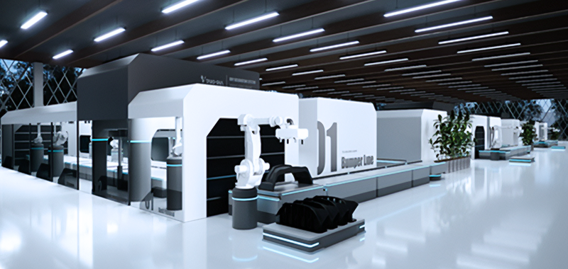 ドライ加飾ラインは、前工程から運ばれてきた対象製品(バンパーなど)をコンベヤ上のパレットに移載し、クリーンルーム内に設置された各工程で自動加飾・仕上げ・検査を行う設備です。