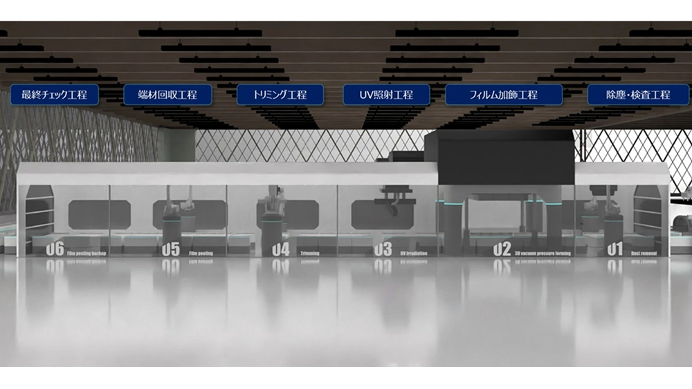 パレットに載せられた製品は、最初に異物やゴミを洗浄除去され、真空圧空技術によりフィルムを貼り付けます。フィルムの層構成・仕様によっては、貼り付け後にUV照射などによる硬化処理を行い、耐久性を高めます。次工程では製品に貼合されたフィルムをトリミング仕上げし、製品以外に残ったフィルムの端材を回収します。