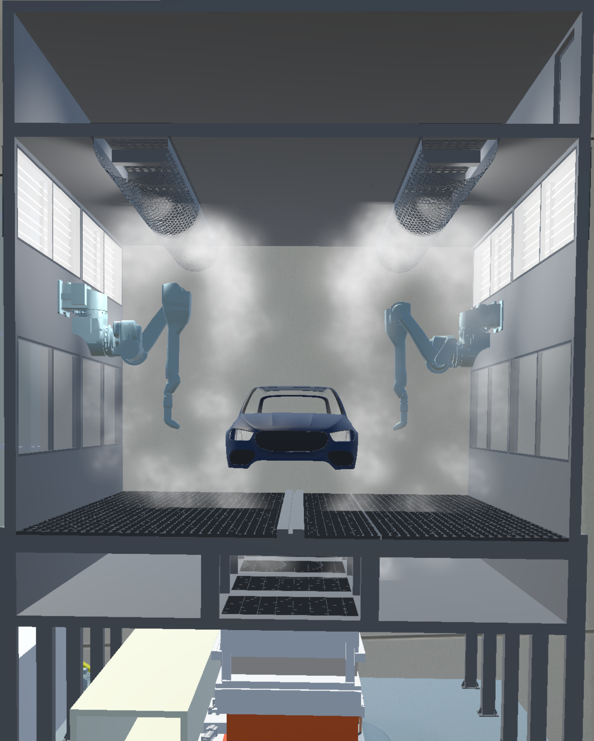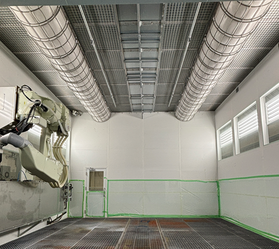 塗装ブースでは被塗物に中塗り・上塗り塗装が施され、意匠性が付与されるとともに、下塗り塗膜を紫外線や風雨などから保護する塗膜が形成されます。塗装ブースが大型化するためコンパクト化や空調制御による省エネ技術などが重要視されます。