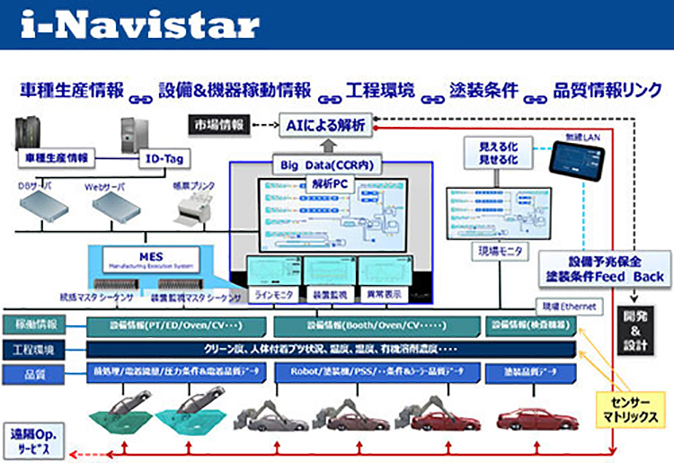 ①塗装プラントの専門家として、各設備でセンシングの必要な項目の提案から、情報解析システムの構築、さらに塗装品質確認結果の各設備要素へのフィードバックまで、総合的な提案を行います。